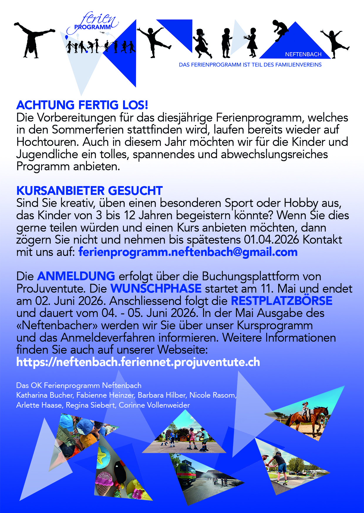 Startseite Aktuelles ACHTUNG FERTIG LOS! ACHTUNG FERTIG LOS! 17. März 2026 Kontakt Ferienprogramm NeftenbachFamilienverein Neftenbach8413 Neftenbachferienprogramm.neftenbach@gmail.com Weitere News 2026 07. Januar 2026 💚 Danke für ein wunderbares Ferienprogramm Neftenbach 2025! 22. August 2025 Wichtige Infos zum Kursstart 🌞🎒 08. Juli 2025 Inhalt